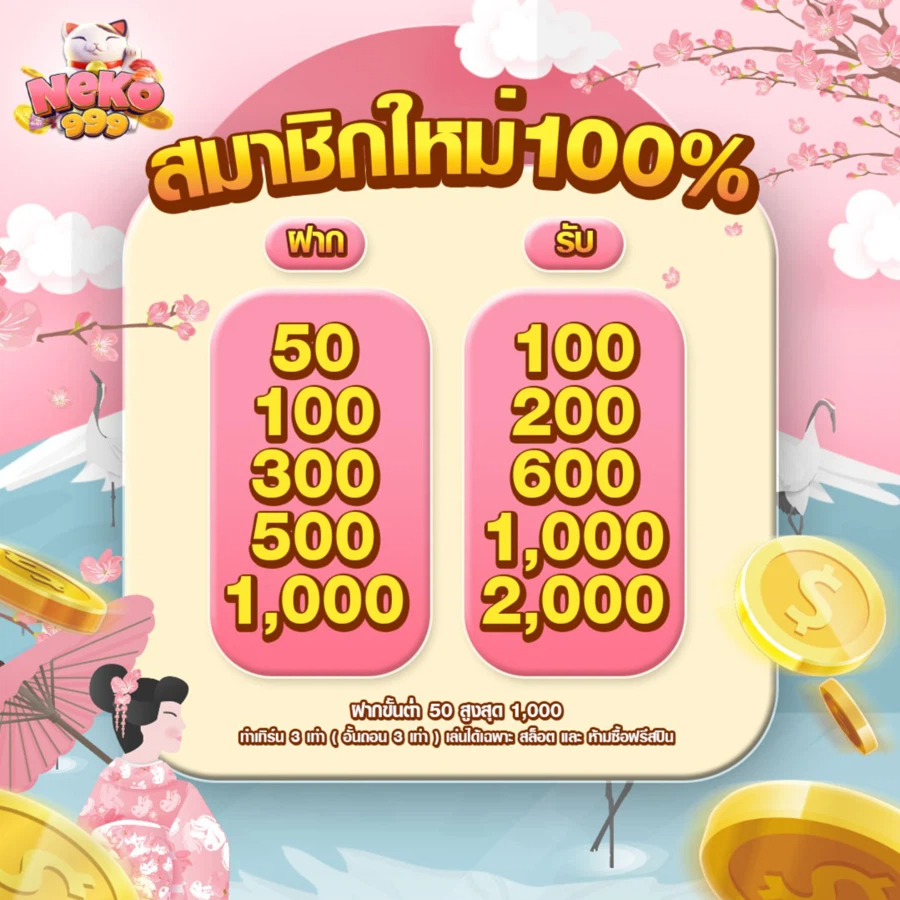 ที่น่าสนใจไม่แพ้กันคือ NEKO999 มีการกำหนดยอดฝากขั้นต่ำที่เหมาะสม เริ่มต้นเพียง 100 บาท และสามารถถอนได้ไม่จำกัดจำนวนครั้งต่อวัน ไม่มีค่าธรรมเนียมใดๆ ทั้งสิ้น ทำให้นักเดิมพันสามารถบริหารจัดการเงินทุนได้อย่างคล่องตัว